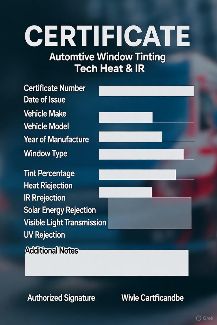 Certification Statement: This certifies that the above-named vehicle has been tinted in accordance with manufacturer's specifications for heat and IR rejection by TintOnTheGo™, with 18+ years of mobile tinting experience.